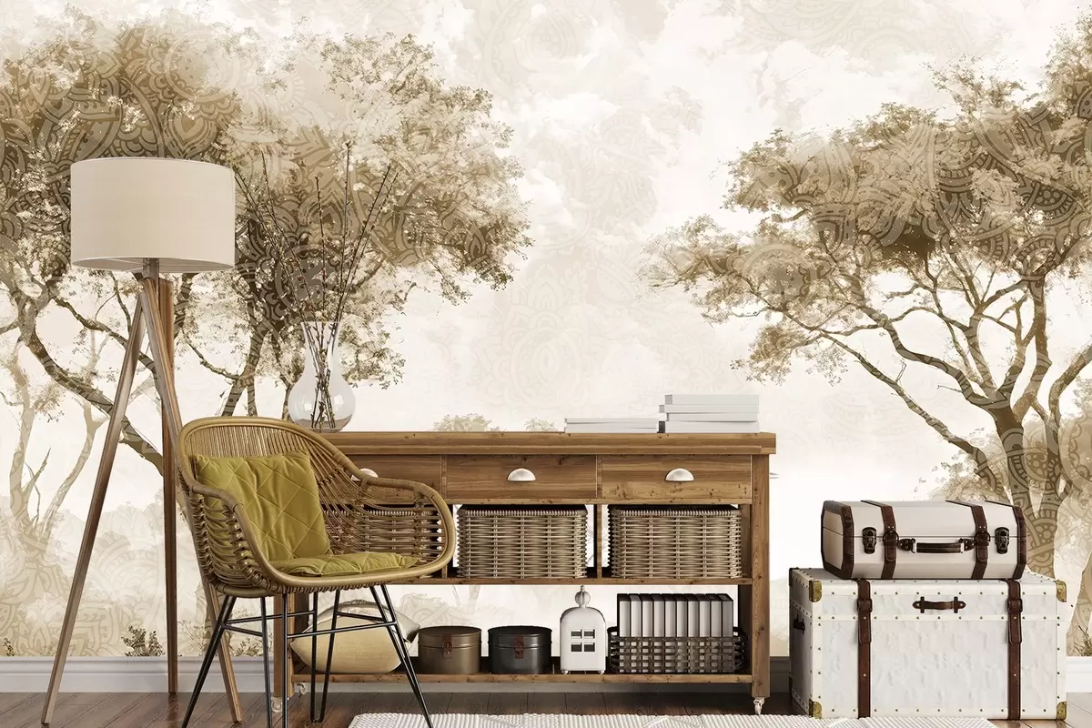 Fototapet Un peisaj cețos, senin, cu copaci siluetați în prim-plan, cu ceață moale în nuanțe de maro și bej Nr. w08442v2