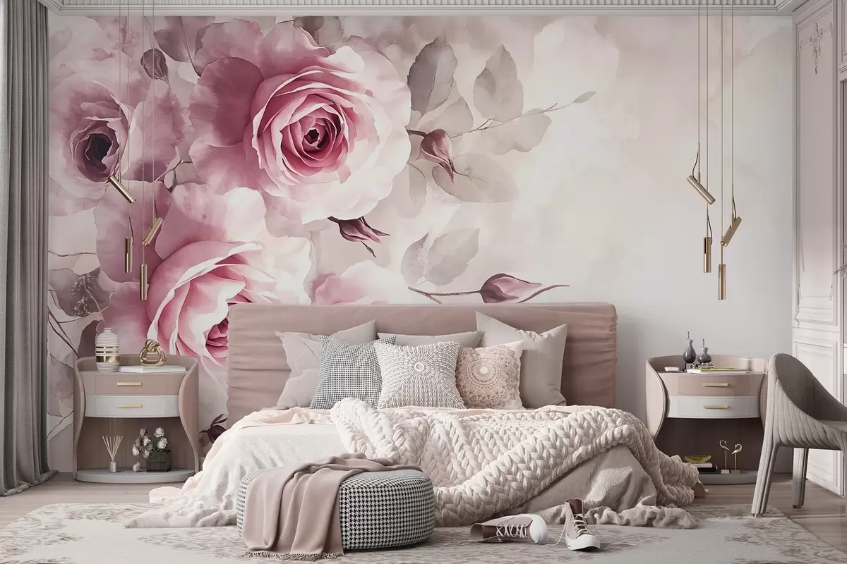 Fototapet Delicate pastel roz trandafiri și frunze cu fundal moale, blurat imitație acuarelă Nr. w08459