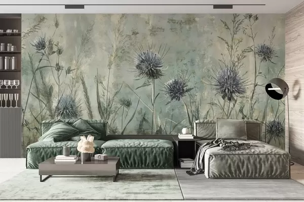 Fototapet Un câmp de flori de ciulin purpuriu cu flori neclare și frunze în fundal textural de epocă Nr. w08463