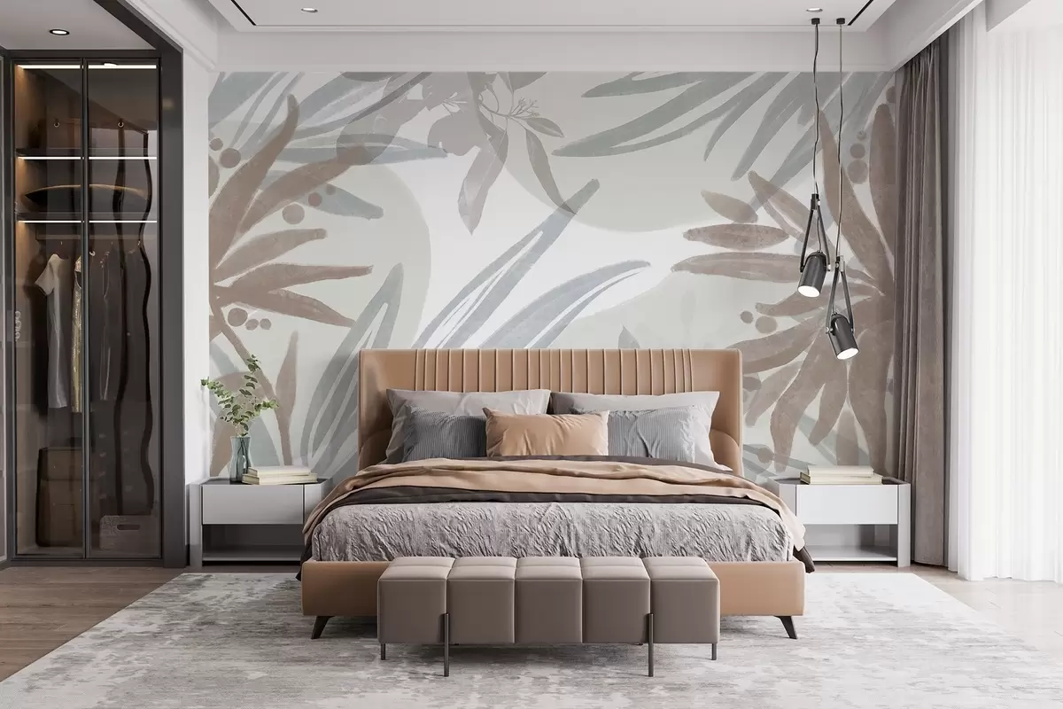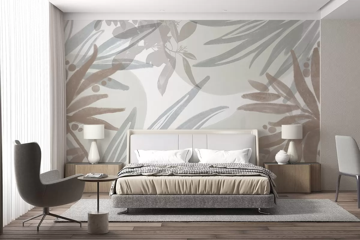 Fototapet Un model floral abstract în tonuri neutre cu frunze și forme suprapuse în nuanțe de gri, alb și bej Nr. w08464
