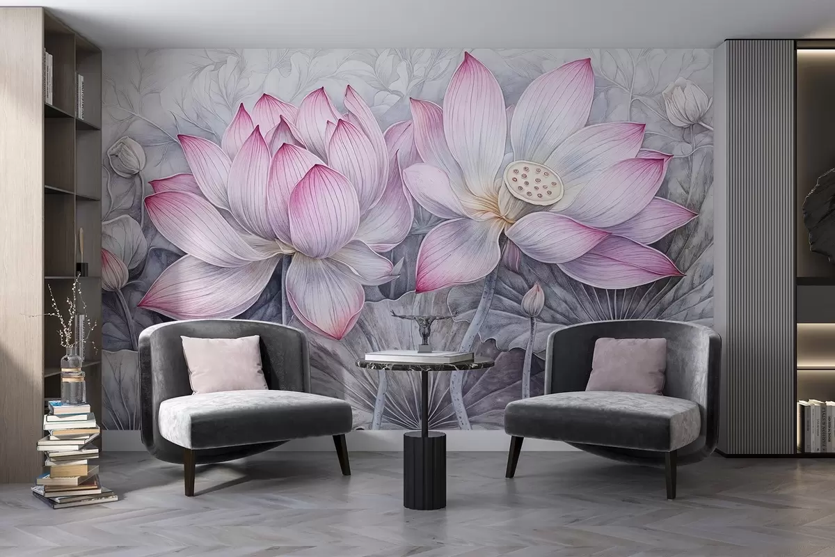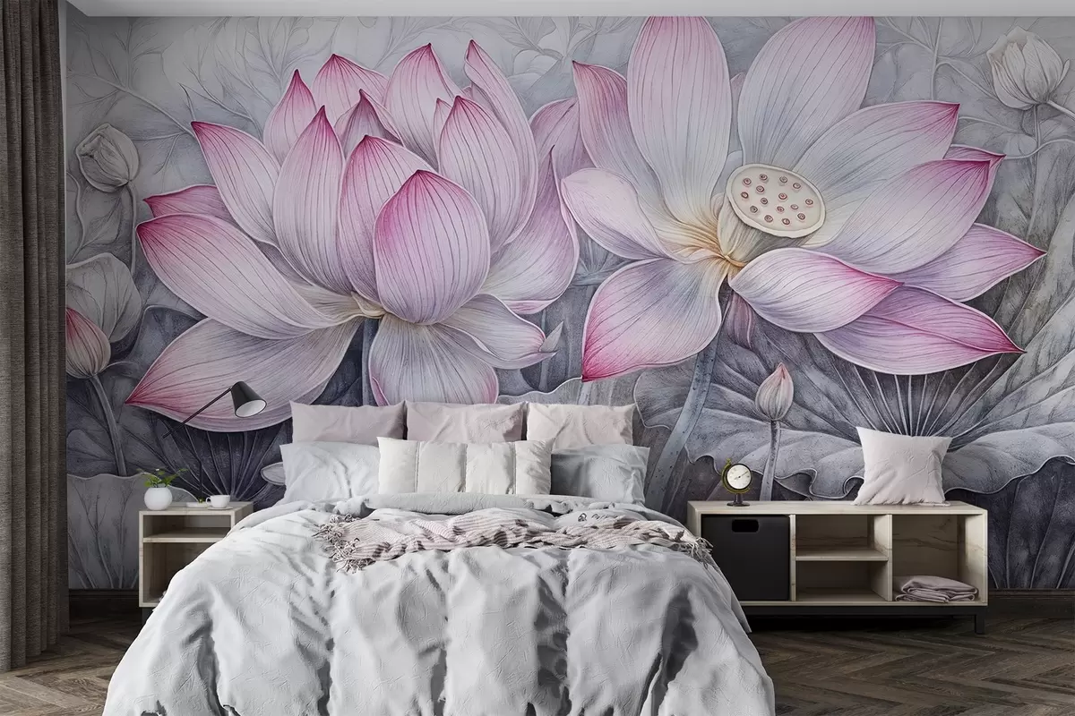 Fototapet Mai multe flori mari de lotus roz cu textură detaliată, cu frunze și tulpini gri-verzui pe un fundal deschis Nr. w08465