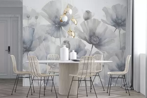 Fototapet Delicate texturale grunge gri și flori albe cu petale moi, neclare pe un fundal alb Nr. w08526