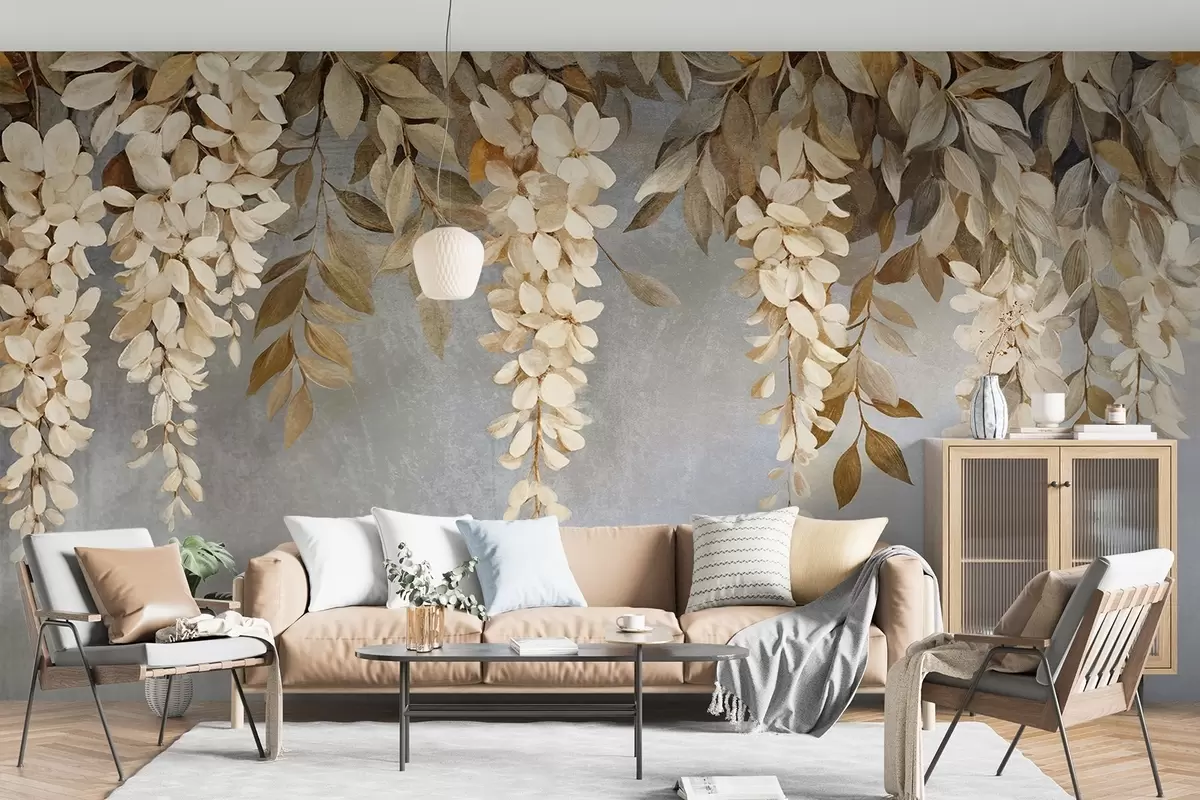Fototapet Flori delicate albe și bej deschis de glicină cu frunze în cascadă pe un fundal gri moale Nr. w08531