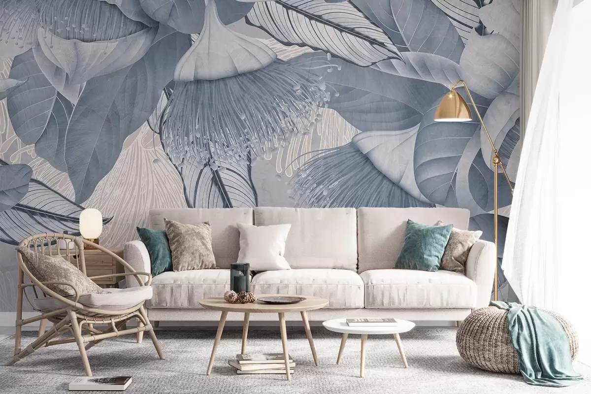 Fototapet Ilustrație botanică de flori mari, eucaliptus albastru cu stamine lungi pe un fundal gri și alb Nr. w08539v1