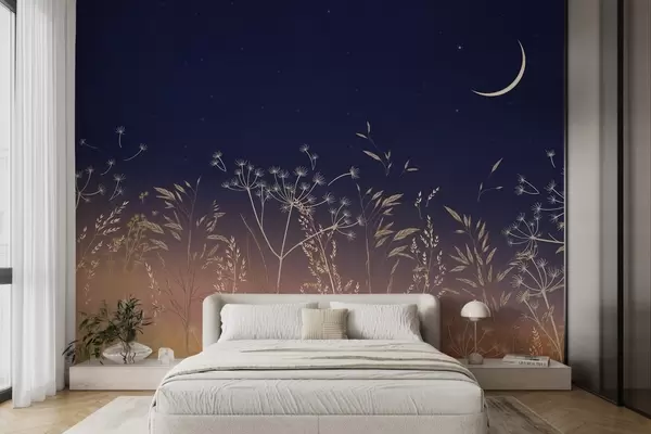 Fototapet Dandelions cu flori sălbatice pe un fundal de apus de soare cu un cer albastru și luna Nr. w08567