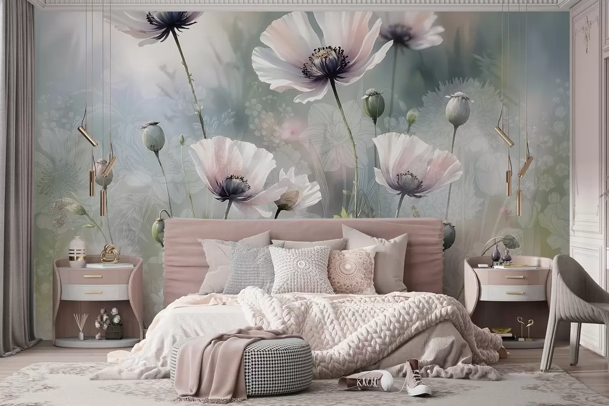 Fototapet Delicate maci roz și violet cu tulpini verzi și muguri pe un fundal moale, blurat texturat Nr. w08585