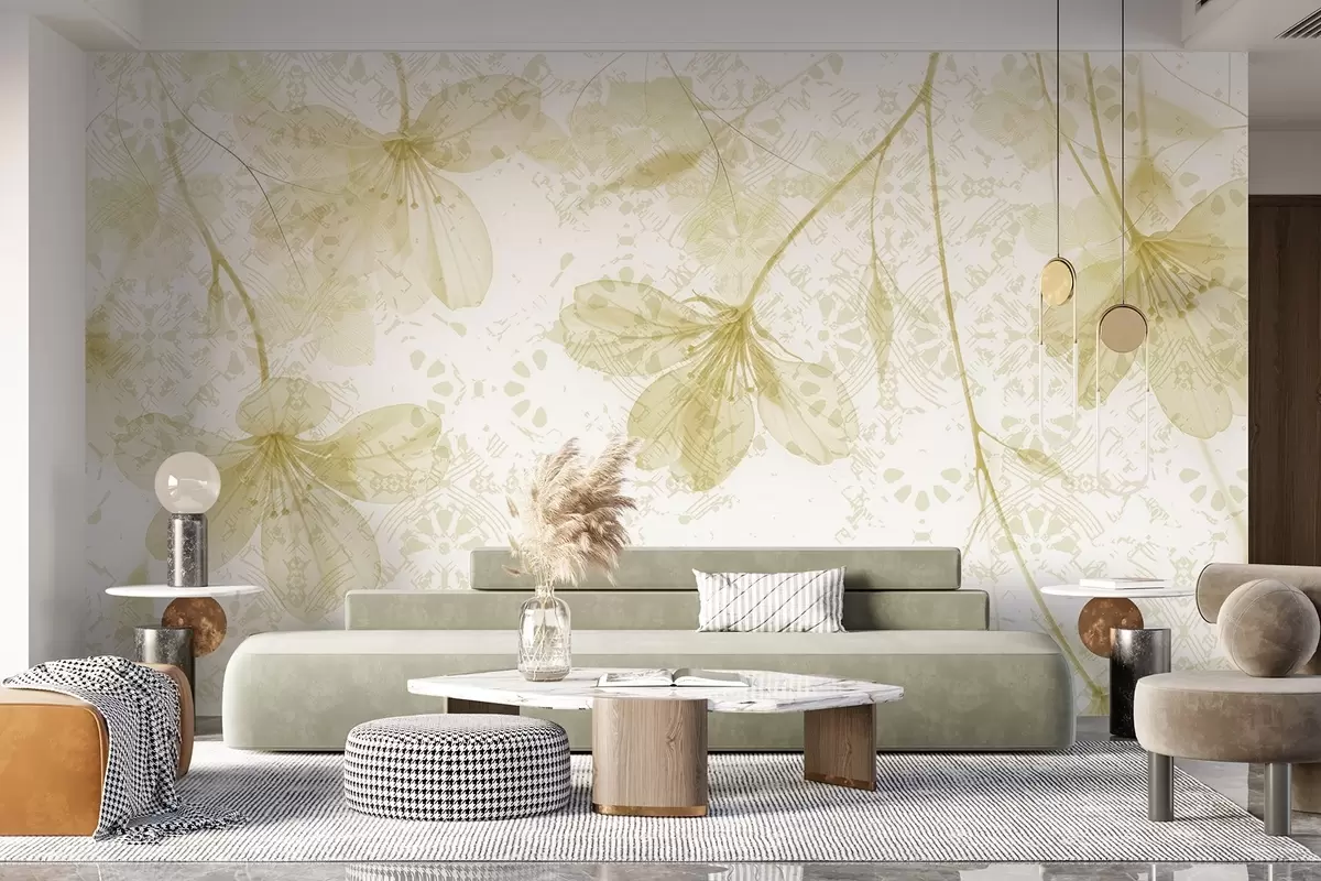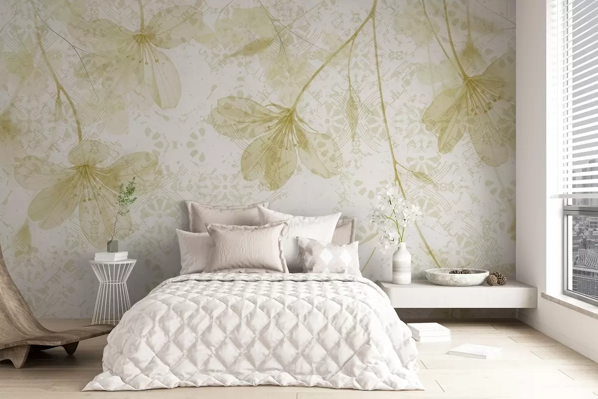 Fototapet Flori delicate galbene și albe cu tulpini lungi și petale pe un fundal textural blând, neclar Nr. w08588v2