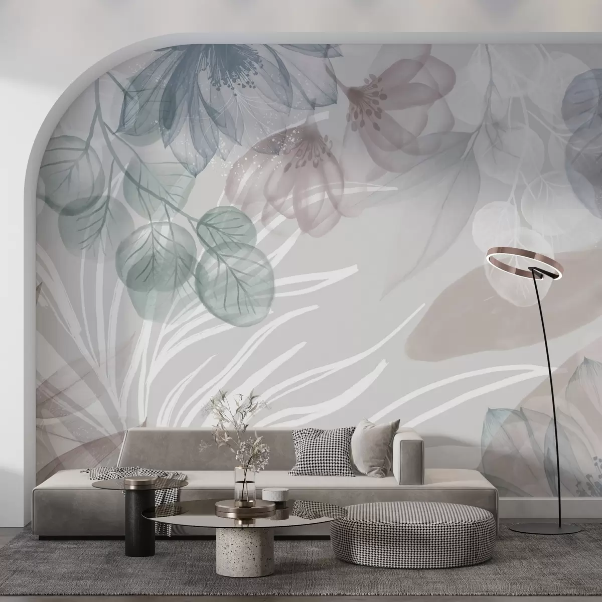 Fototapet Imprimeu floral în culori pastelate cu flori și frunze abstracte mari transparente în nuanțe de gri, roz și verde Nr. w08600