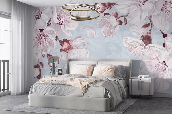 Fototapet Un imprimeu floral cu flori mari de cireș roz și alb pe un fundal textural albastru deschis Nr. w08601