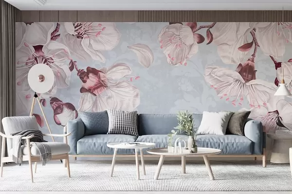 Fototapet Un imprimeu floral cu flori mari de cireș roz și alb pe un fundal textural albastru deschis Nr. w08601