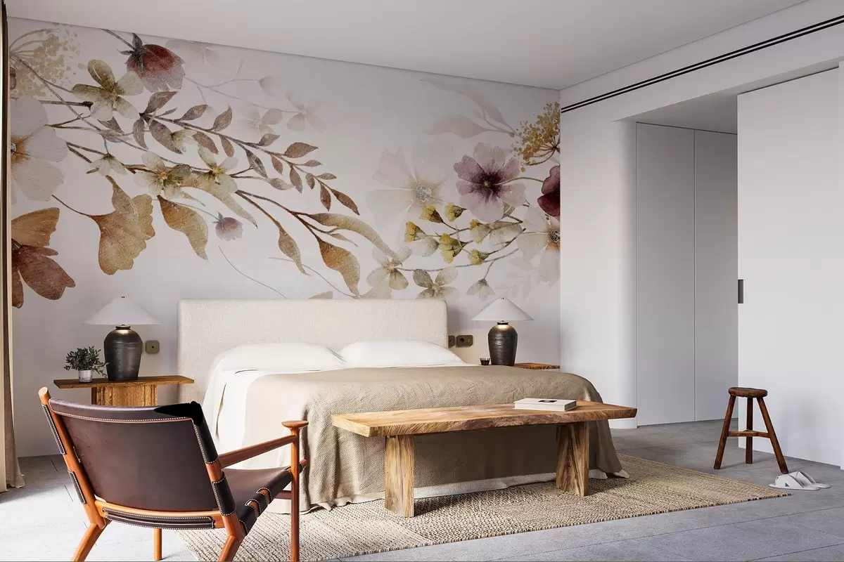 Fototapet Aranjament floral cu culori moi, atenuate, cu flori și frunze bej și albe pe un fundal deschis Nr. w08603
