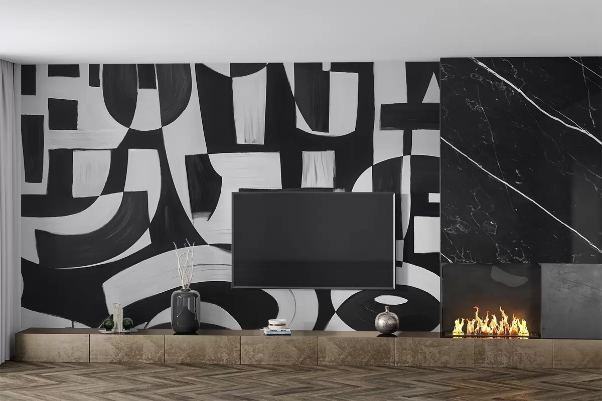fototapet Forme și modele geometrice abstracte alb-negru, care creează o compoziție vizuală izbitoare și dinamică w08608