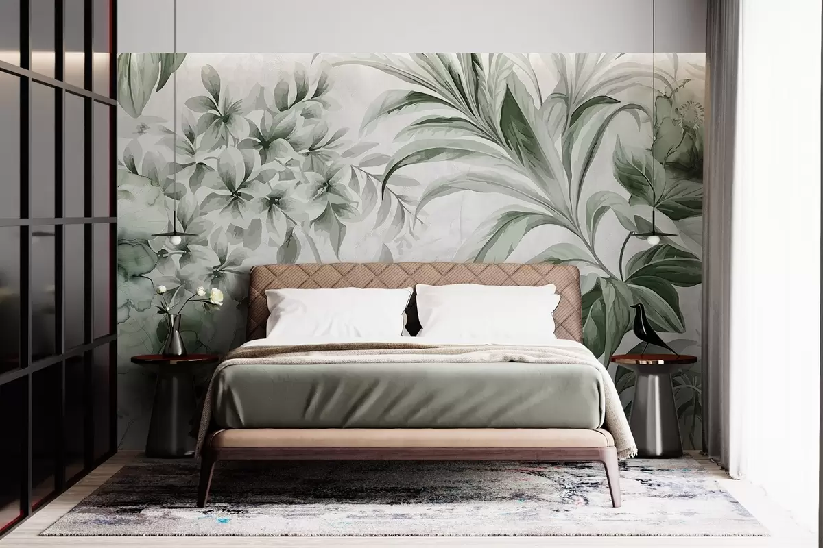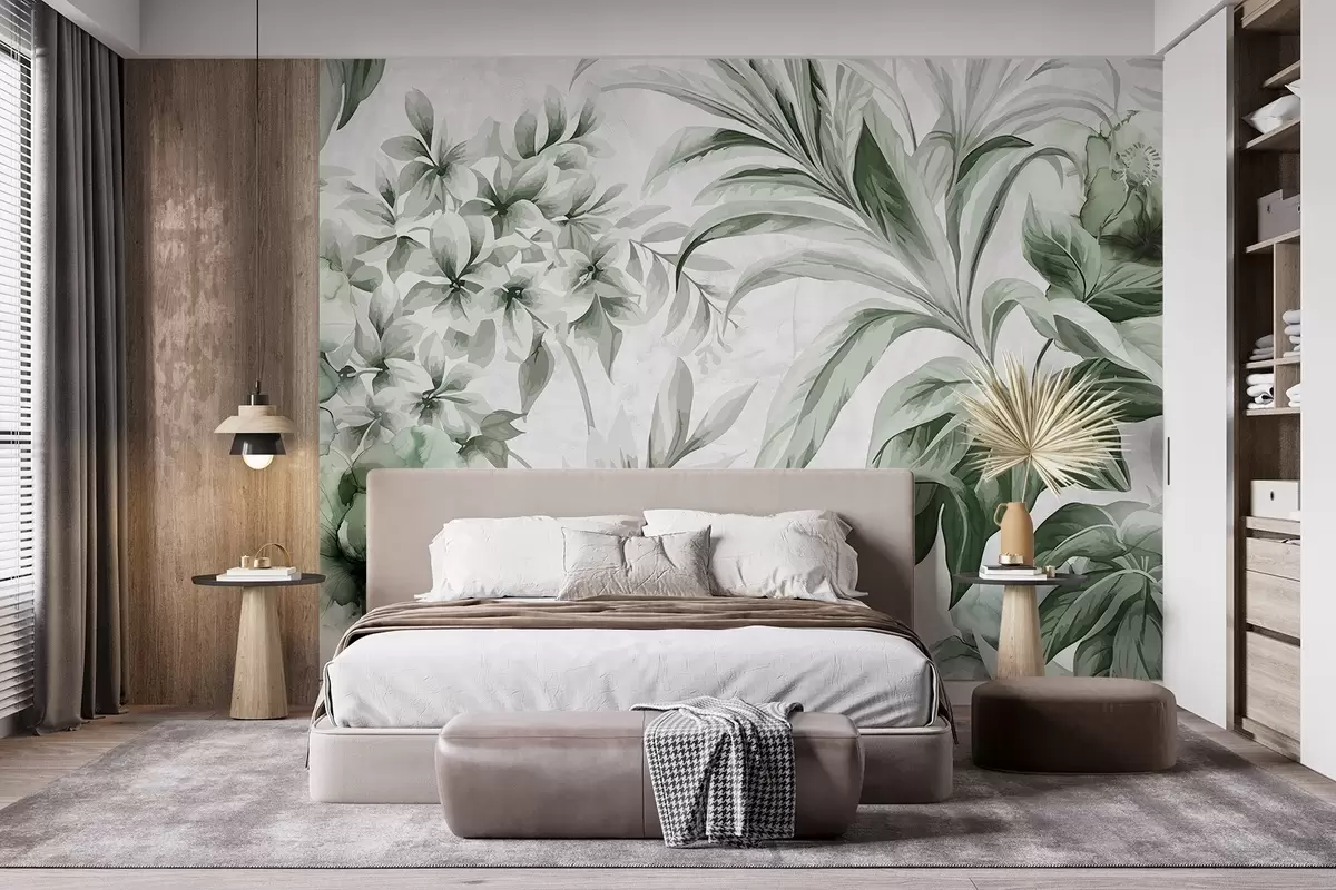 fototapet Frunze tropicale și frunze într-o paletă atenuată, variind de la nuanțe deschise la nuanțe închise de verde pe un fundal ușor texturat w08650