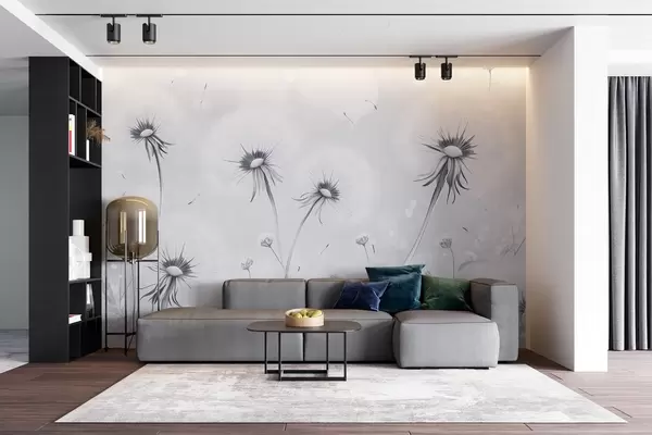 Fototapet Păpădii elegante și flori sălbatice în stil pictură în tonuri de albastru Nr. w08657v2