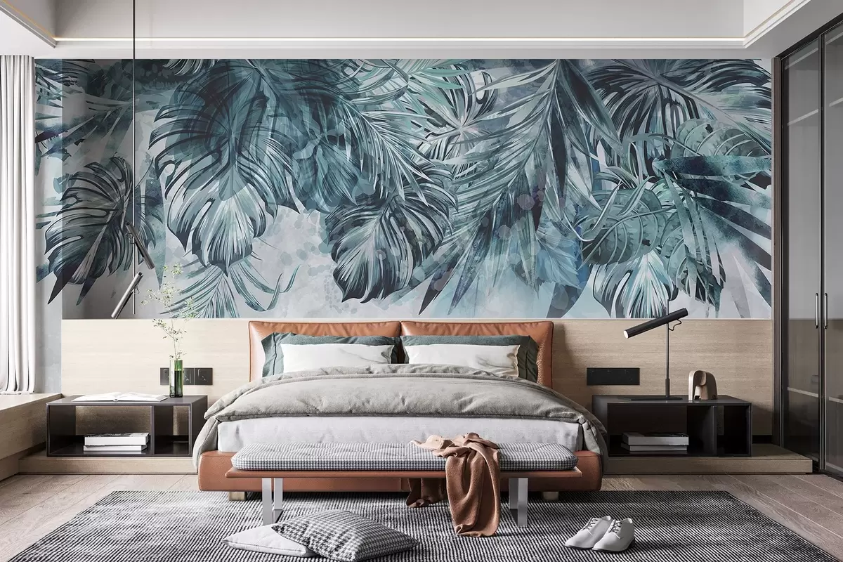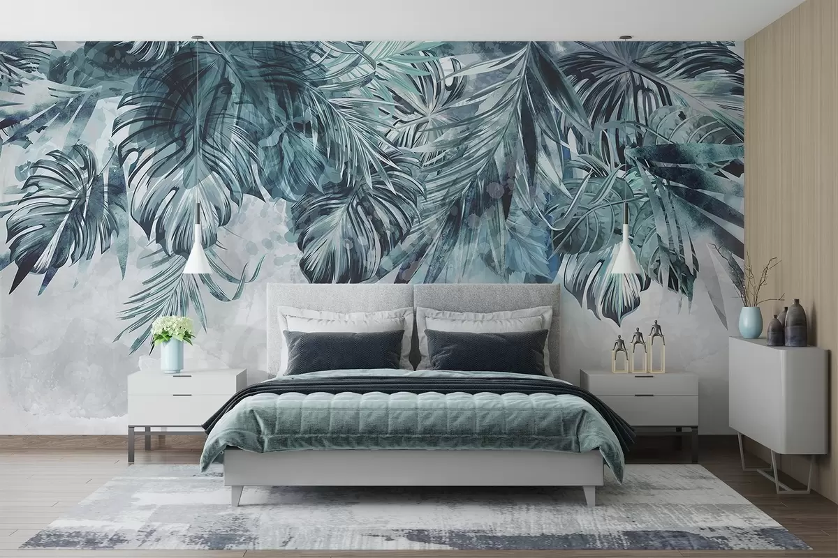 Fototapet Frunze tropicale în nuanțe de turcoaz și verde, în cascadă de sus, pe un fundal ușor, texturat Nr. w08667