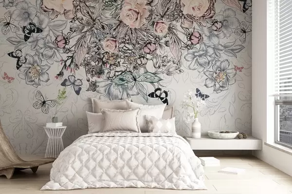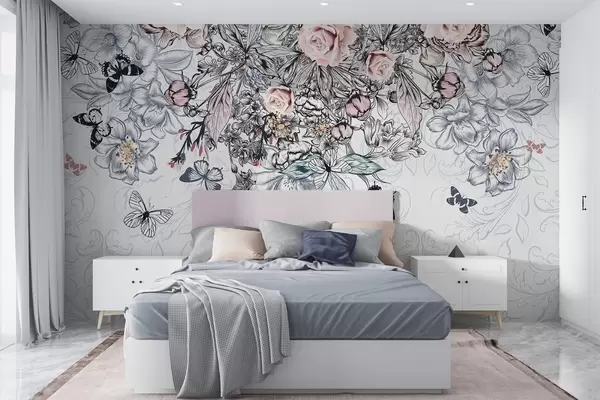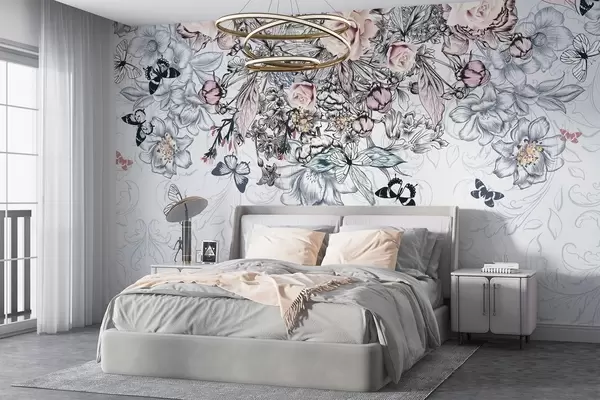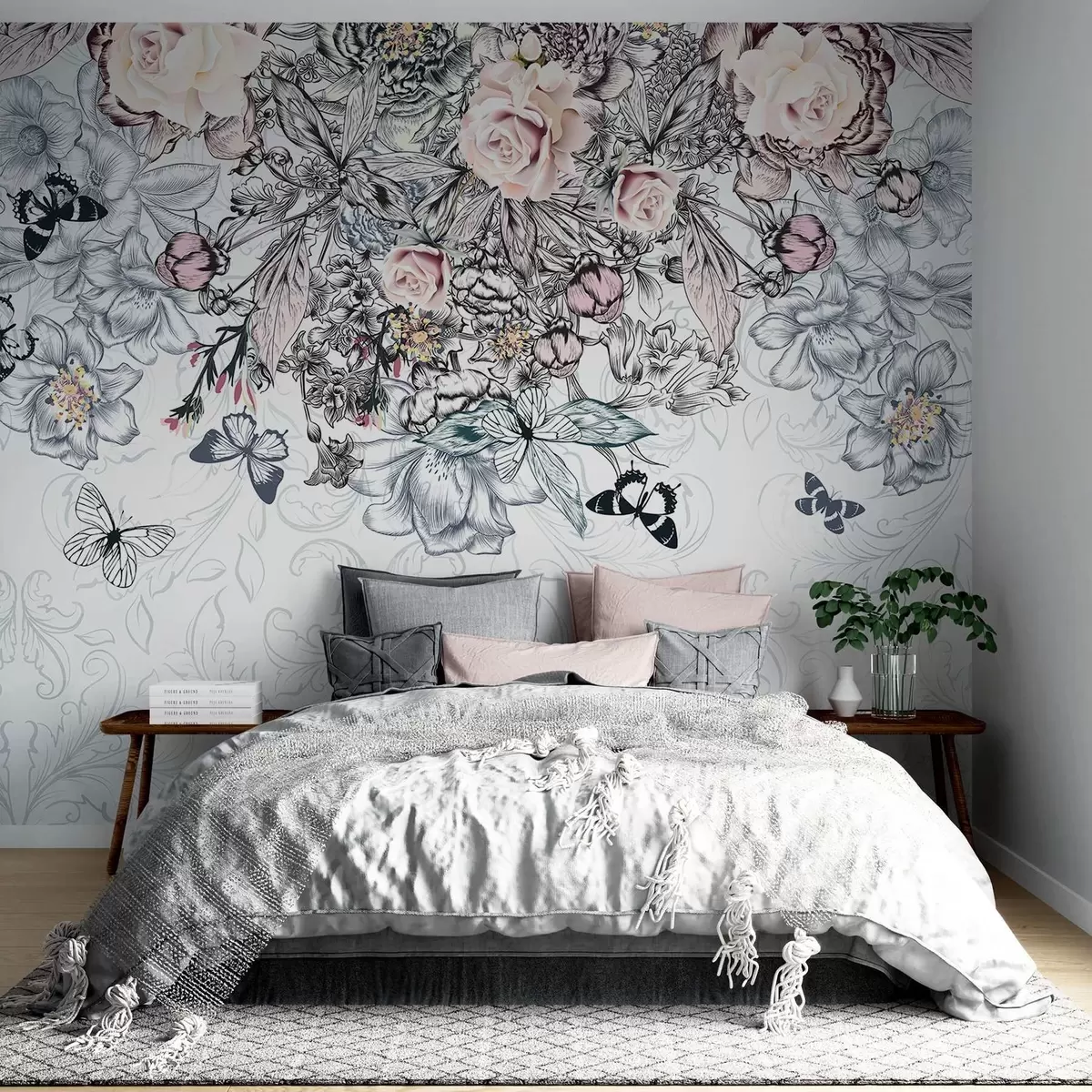 fototapet Un desen floral cu trandafiri roz și diverse flori și fluturi cu artă linie complexă pe fundal texturat w08674