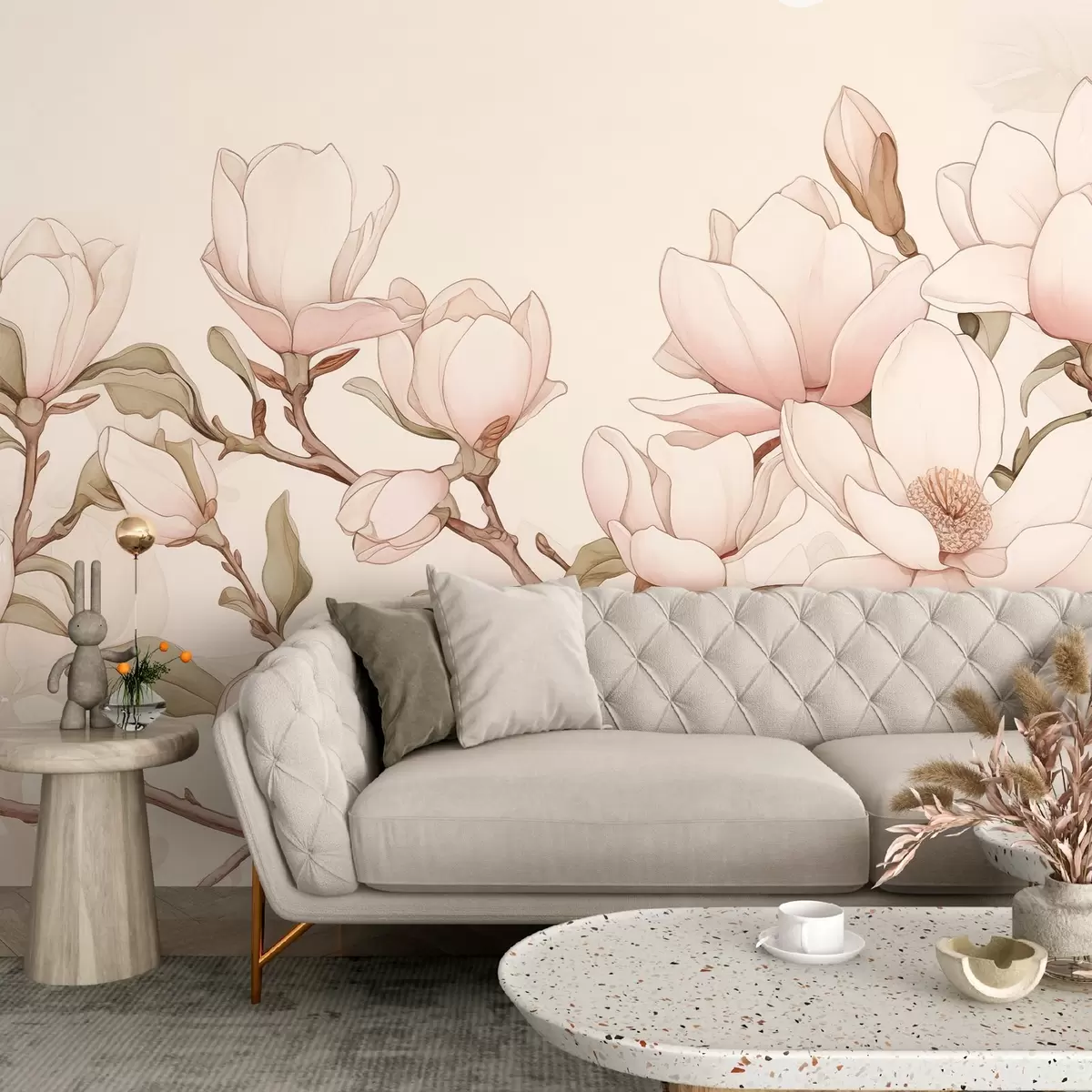 Fototapet Ramuri de magnolie cu flori roz delicate pe un fundal deschis, creând o atmosferă sofisticată și calmă Nr. w08688