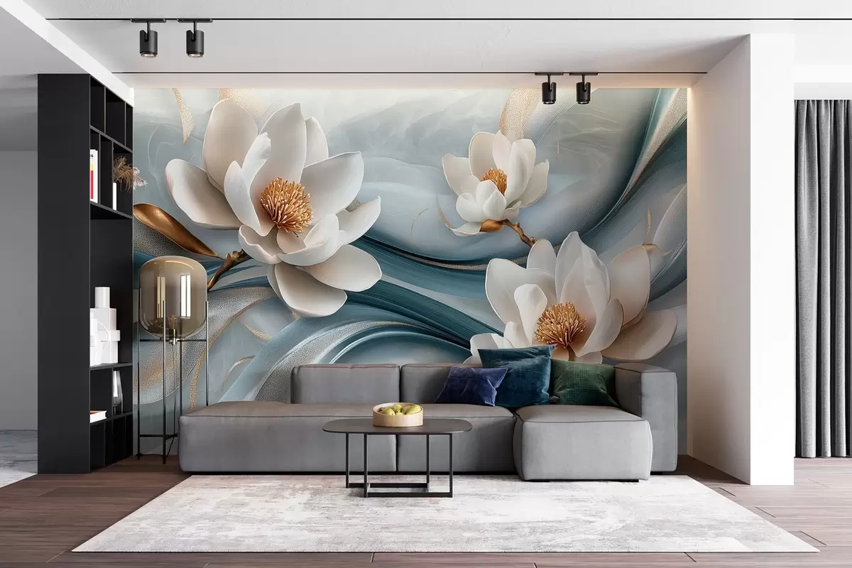 Fototapet Flori de magnolie combinate cu tonuri de albastru, alb și galben cu valuri abstracte Nr. w08695