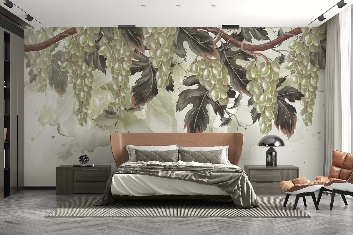 Fototapet Struguri agățați de o viță de vie cu frunze verzi, pe un fundal deschis la culoare cu texturi asemănătoare acuarelei Nr. w08696