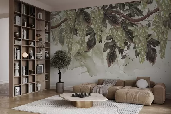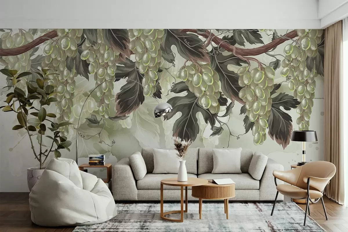Fototapet Struguri agățați de o viță de vie cu frunze verzi, pe un fundal deschis la culoare cu texturi asemănătoare acuarelei Nr. w08696