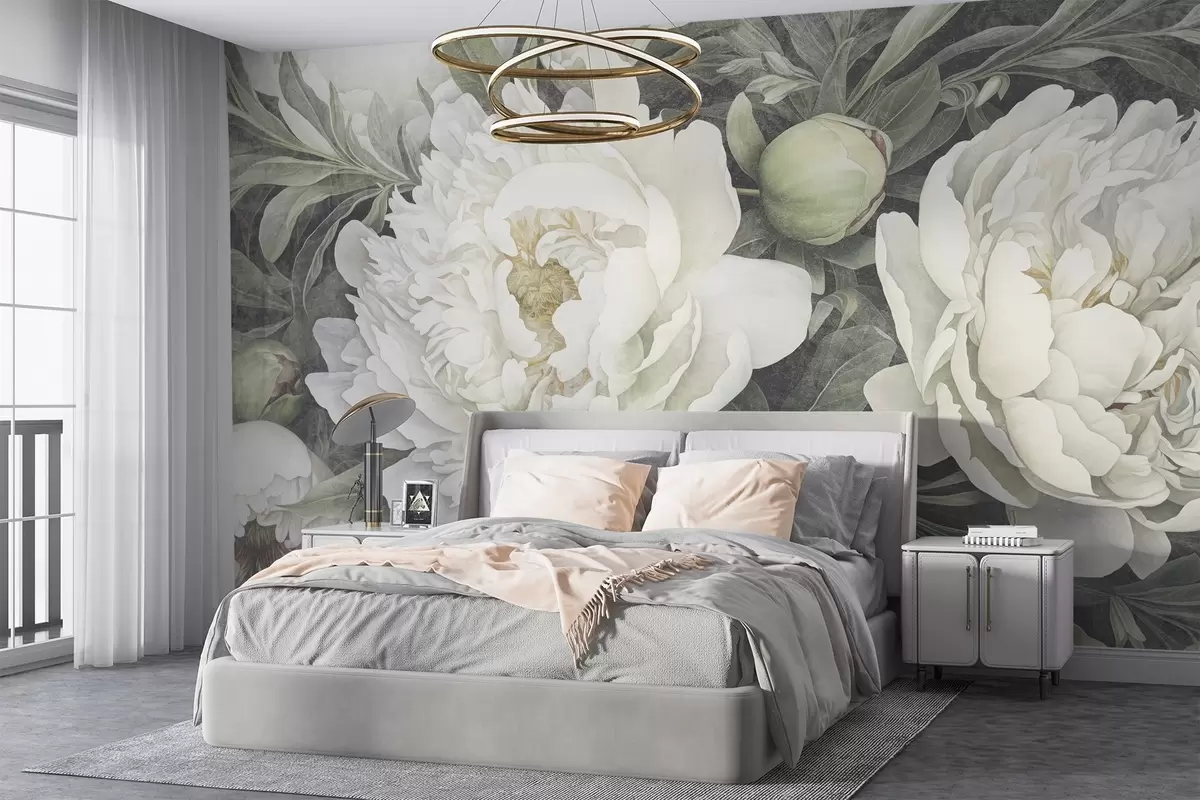 Fototapet Peonii albe pastelate texturate cu boboci și frunze verde moale cu petale delicate Nr. w08697