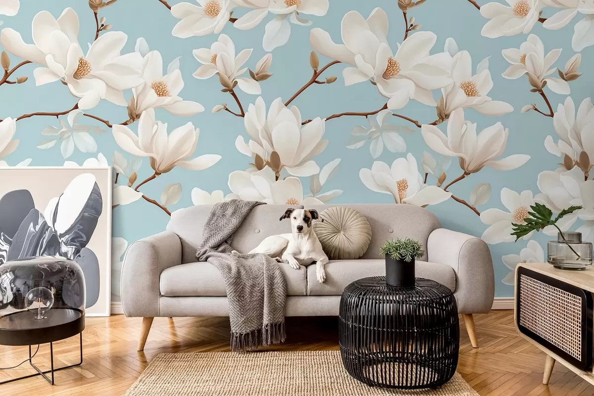 Fototapet Model de flori de magnolie albe, fundal albastru pastel, frunze și ramuri albe Nr. w08726