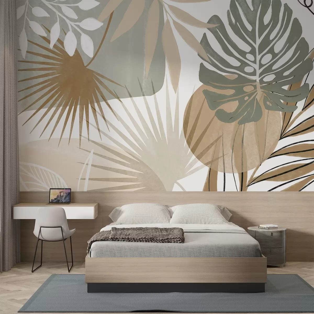 Fototapet Design abstract cu diverse frunze tropicale și în tonuri pământii de verde, bej și crem Nr. w08738v1