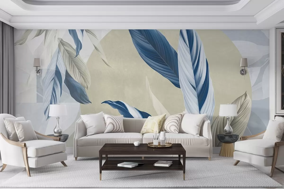 Fototapet Compoziție texturală geometrică modernă și abstractă cu frunze detaliate în nuanțe de albastru, bej și alb Nr. w08741
