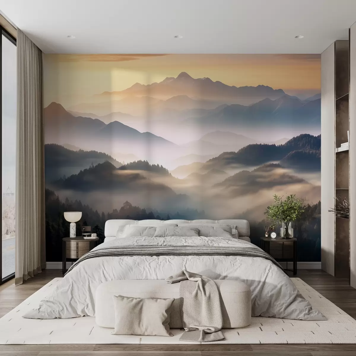 Fototapet Peisaj montan senin în zori, cu ceață moale învăluind pinii Nr. w08748