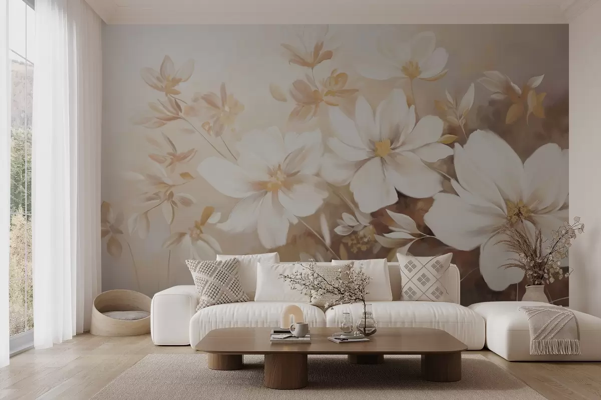 Fototapet Flori albe pictate cu petale moi și frunze delicate, pe un fundal bej deschis și crem Nr. w08780