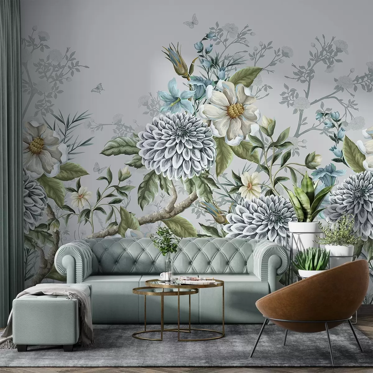 Fototapet Un imprimeu floral cu crizanteme, flori albastre delicate și frunze verzi împletite cu ramuri Nr. w08782