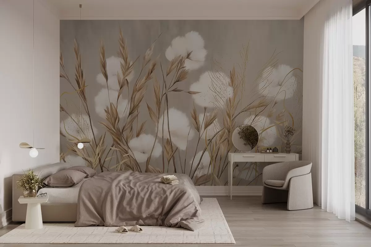 Fototapet Flori albe moi, pufoase din bumbac și ierburi înalte portocalii cu spikelets pe un fundal bej cu textură atenuată Nr. w08784