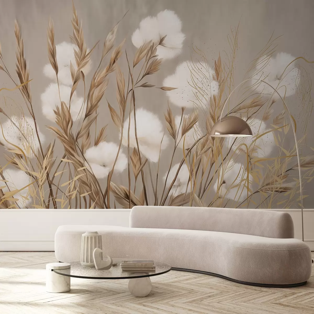 Fototapet Flori albe moi, pufoase din bumbac și ierburi înalte portocalii cu spikelets pe un fundal bej cu textură atenuată Nr. w08784