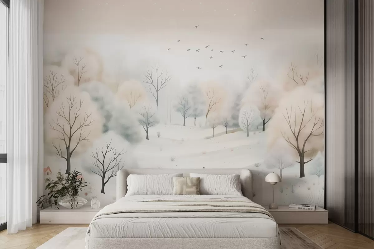 Fototapet Pădure de iarnă cu copaci, case mici, păsări și zăpadă într-un stil de acuarelă ușoară Nr. w08815
