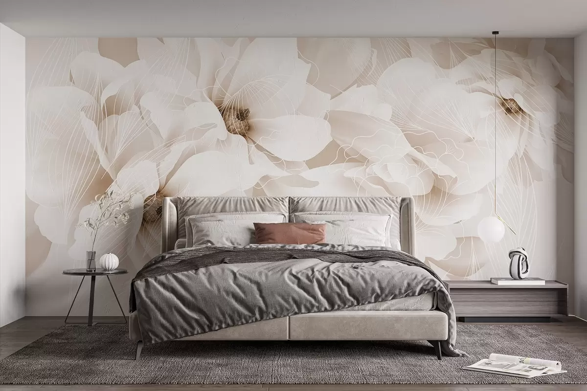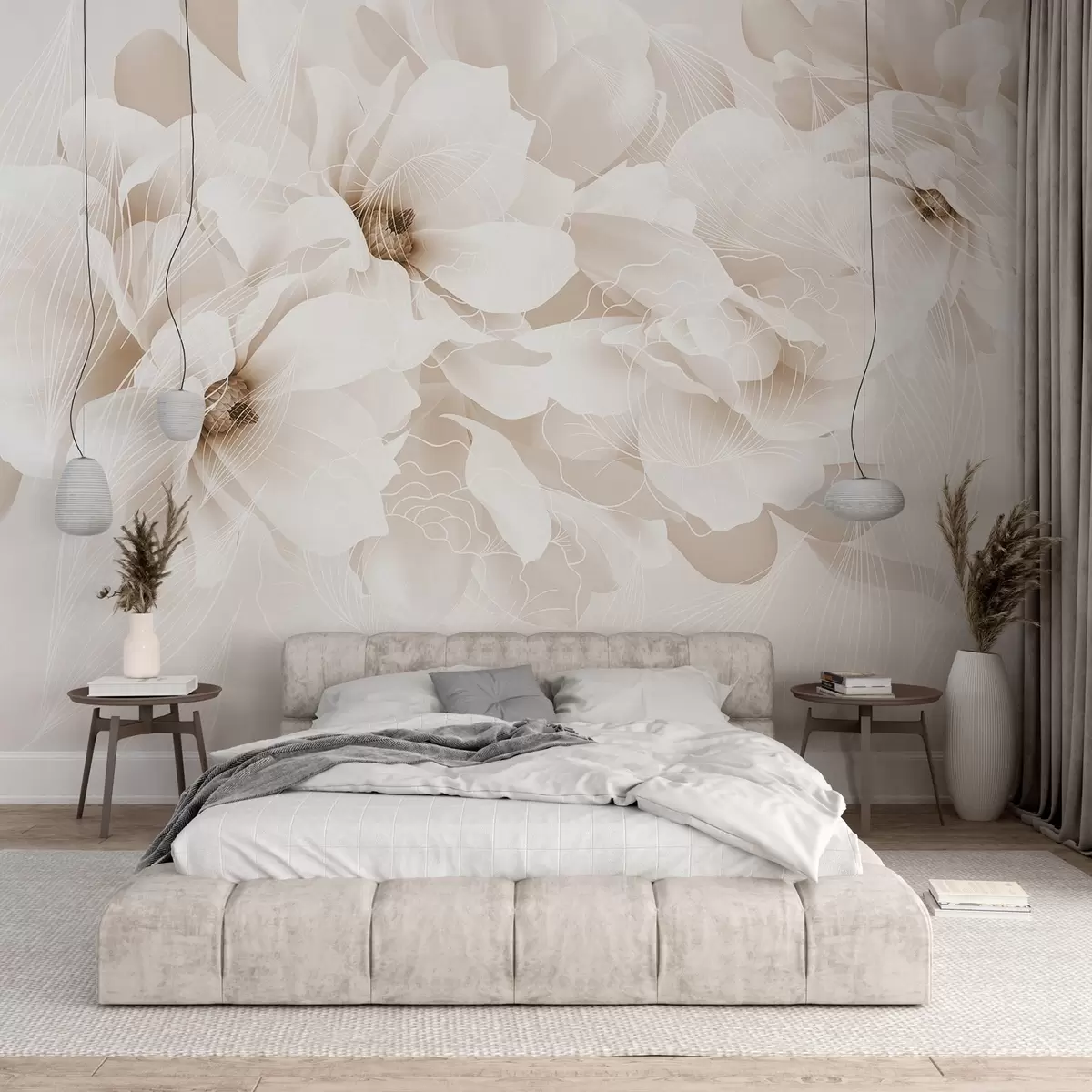 Fototapet Flori pastelate de bujor cu petale delicate albe și bej și linii albe pe un fundal bej deschis Nr. w08826v1