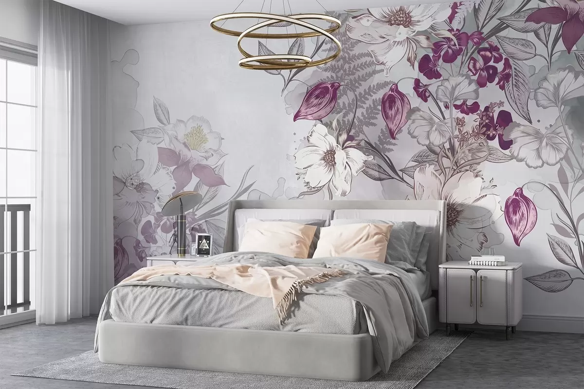 Fototapet Flori cu petale albe și violet, frunze și tulpini , efect de acuarelă , fundal texturat gri deschis Nr. w08899