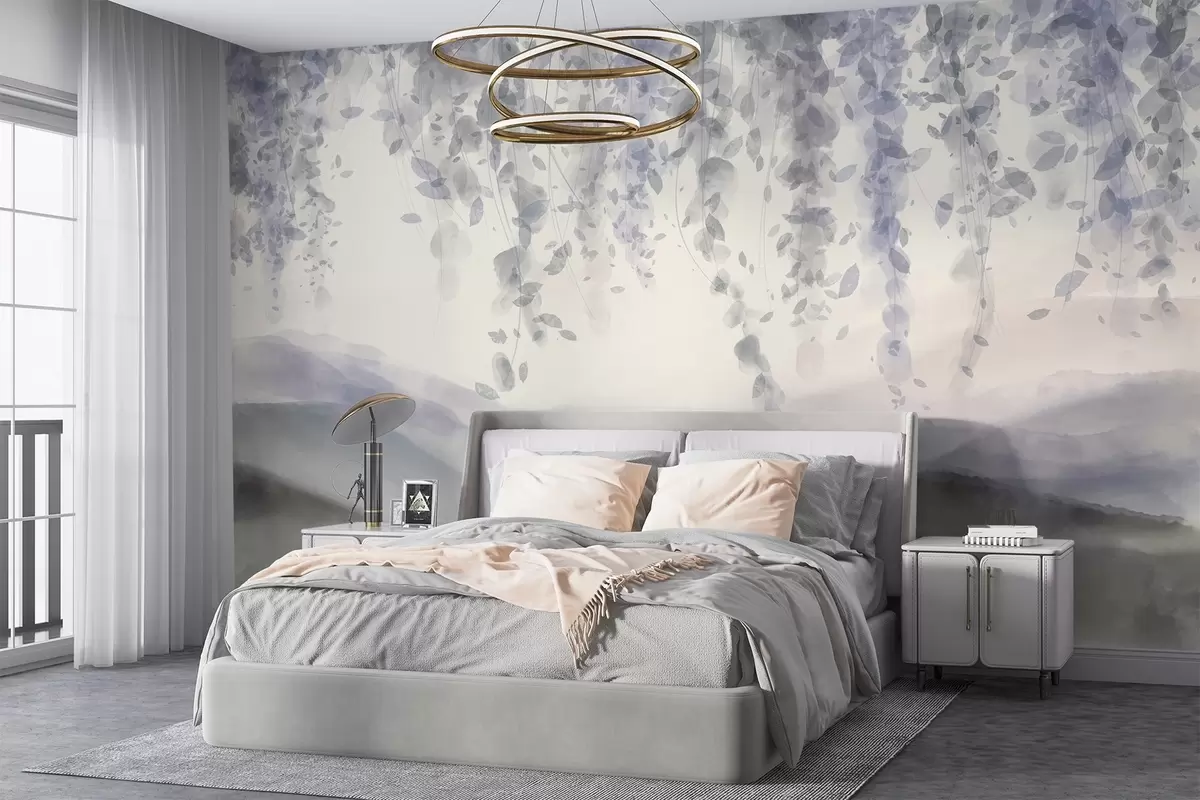 Fototapet Wisteria frunze agățat peste munți blured, moale pastel albastru și gri culori, peisaj stil acuarelă Nr. w08909