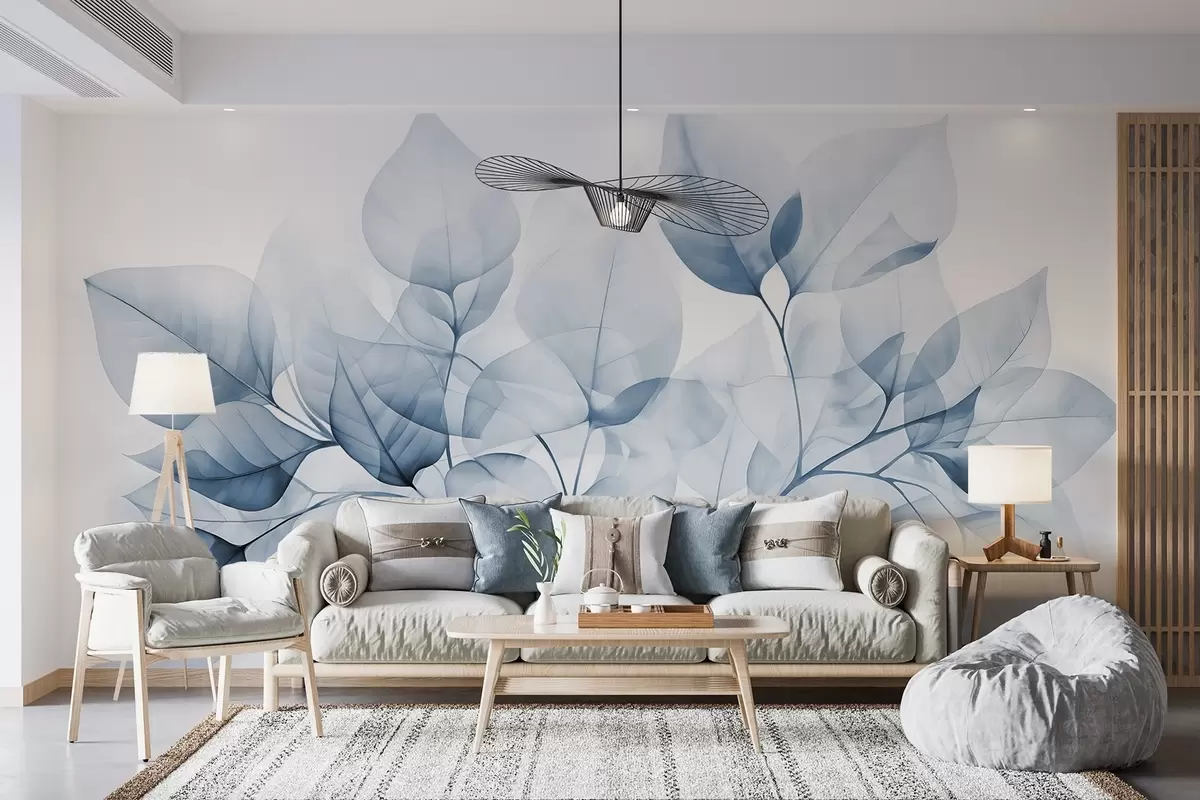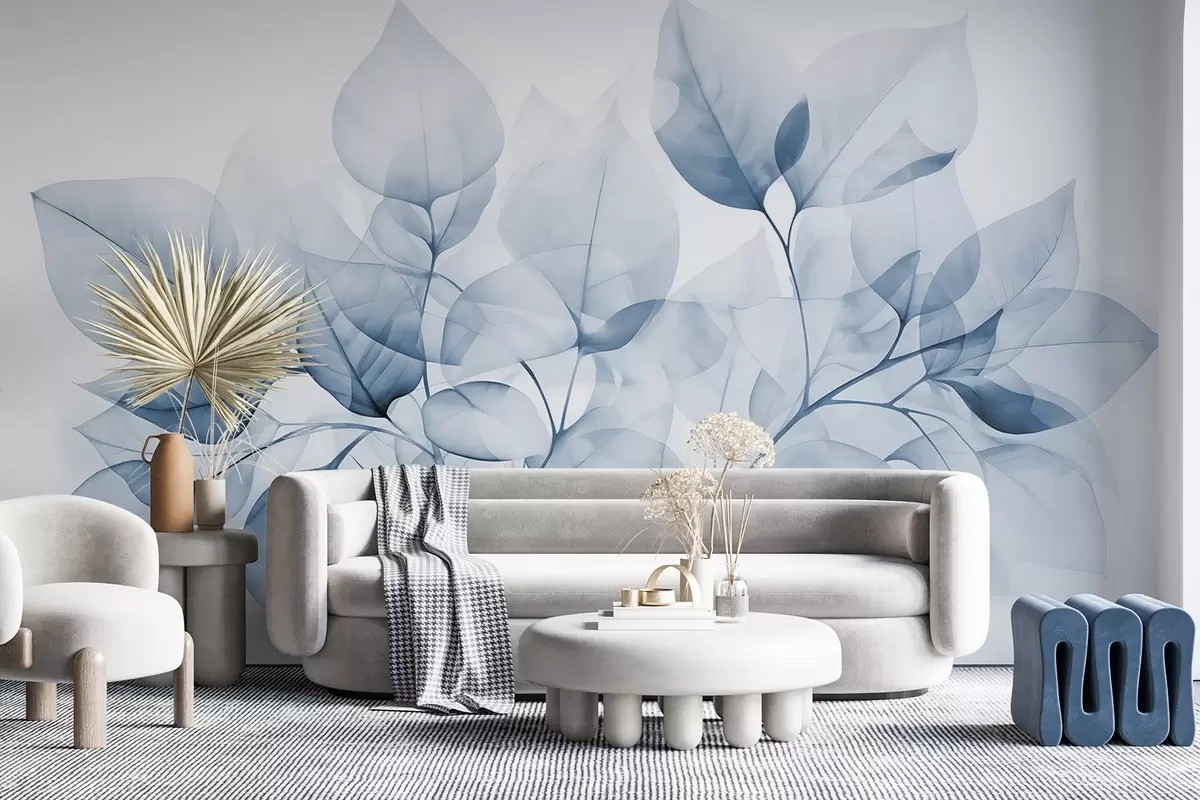 Fototapet Pictură acuarelă de frunze translucide în culori pastelate, cu nuanțe de alb și albastru Nr. w08910v1