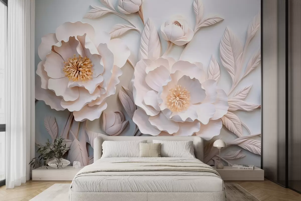 Fototapet bujori în relief 3D în stil frescă cu un accent galben Nr. w08967