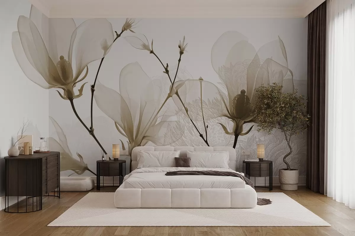 Fototapet Flori de magnolie bej translucid cu siluete de flori cu petale delicate și tulpini întunecate Nr. w08978v1