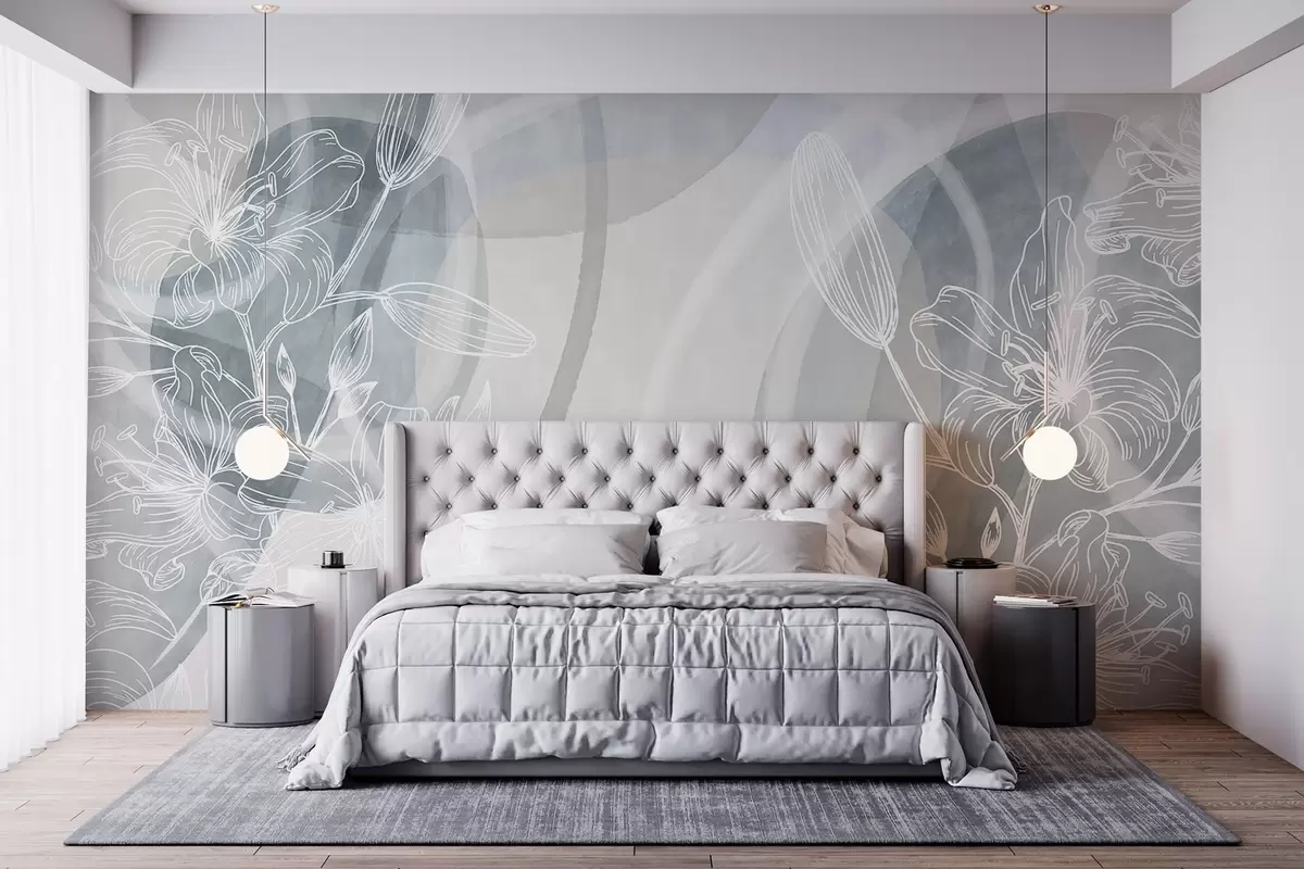 Fototapet Design floral minimalist cu flori și frunze albe line art, cercuri abstracte suprapuse în nuanțe de gri și albastru Nr. w08979