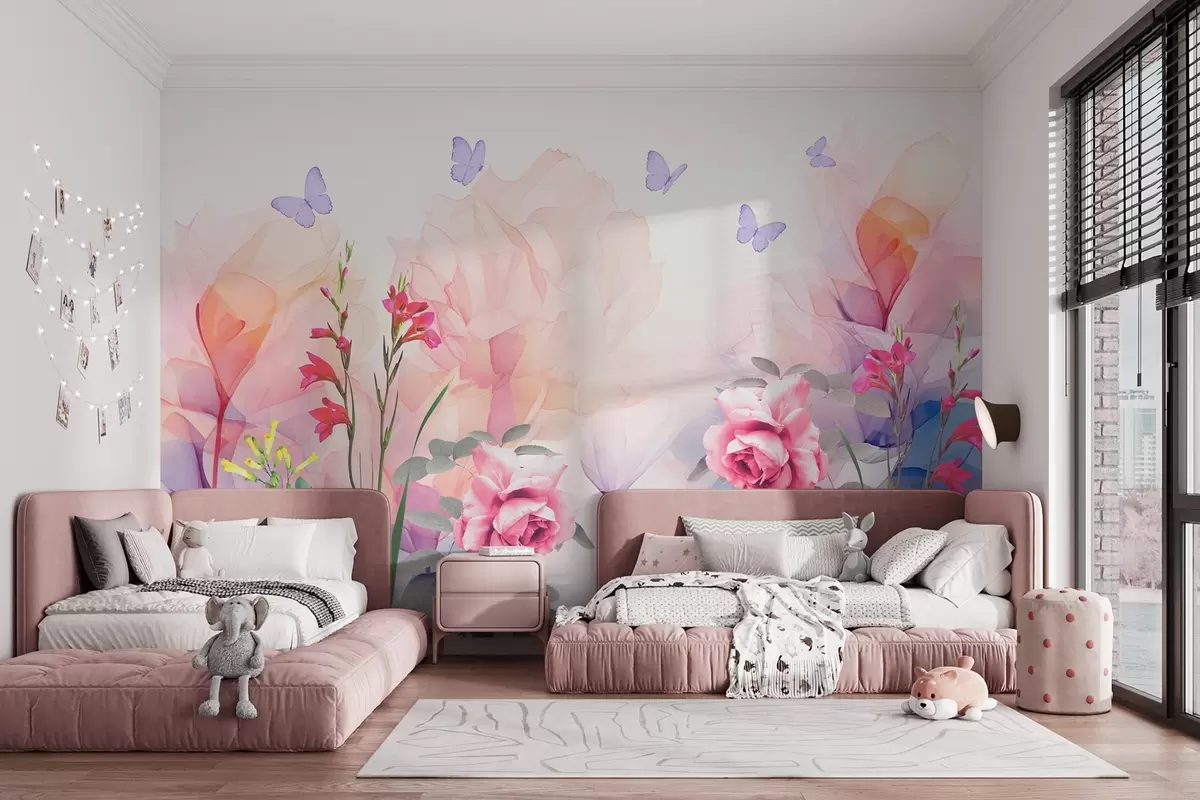 Fototapet Flori cu fluturi și trandafiri în stil acuarelă Nr. w09002