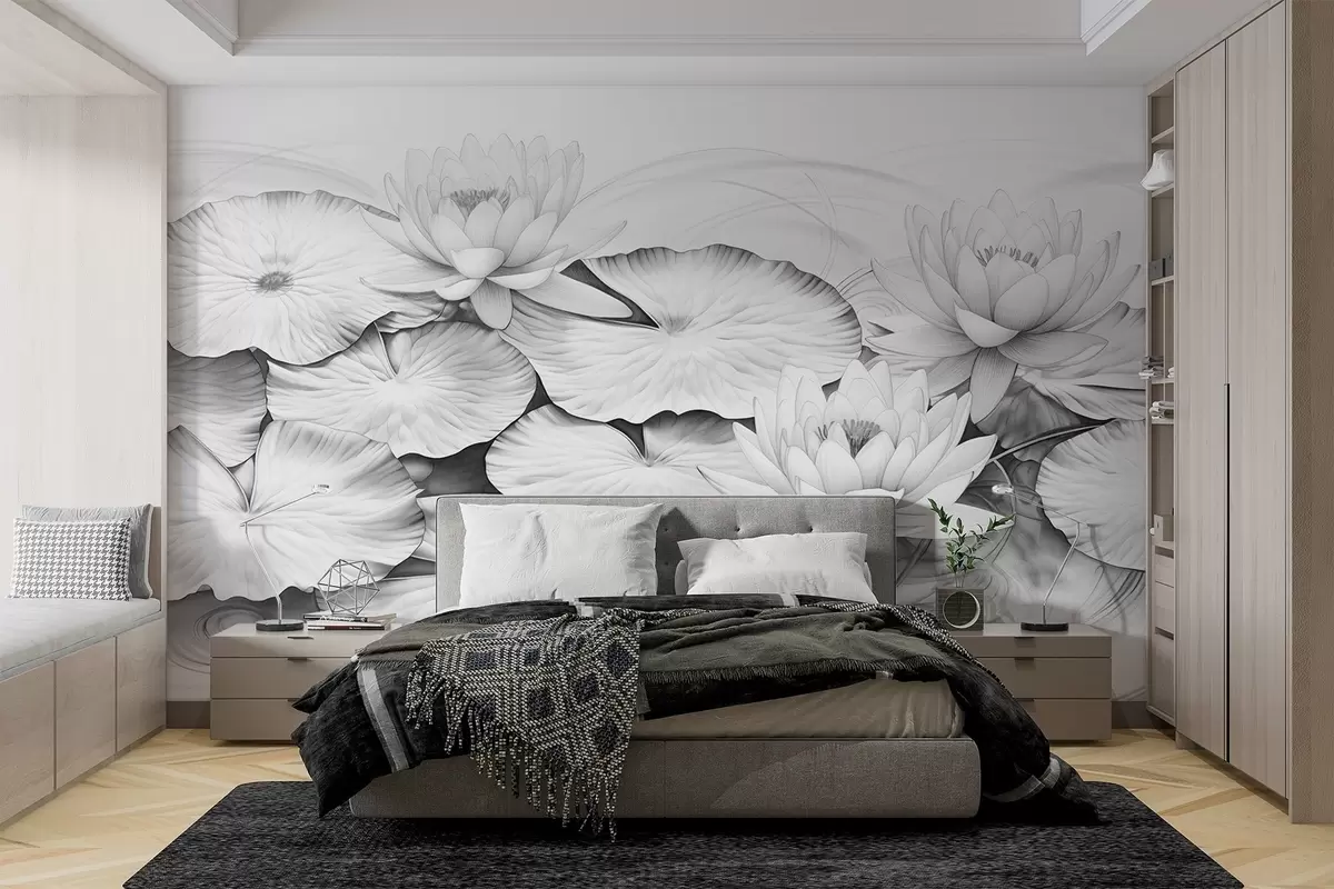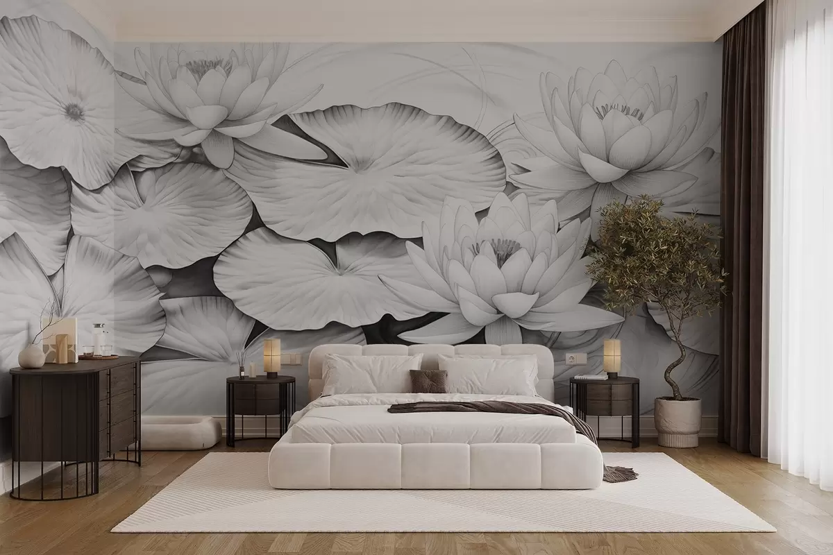 Fototapet Nuferi și nuferi într-un iaz, imitație alb-negru a desenului în creion, ilustrație botanică detaliată, artă a naturii Nr. w09006