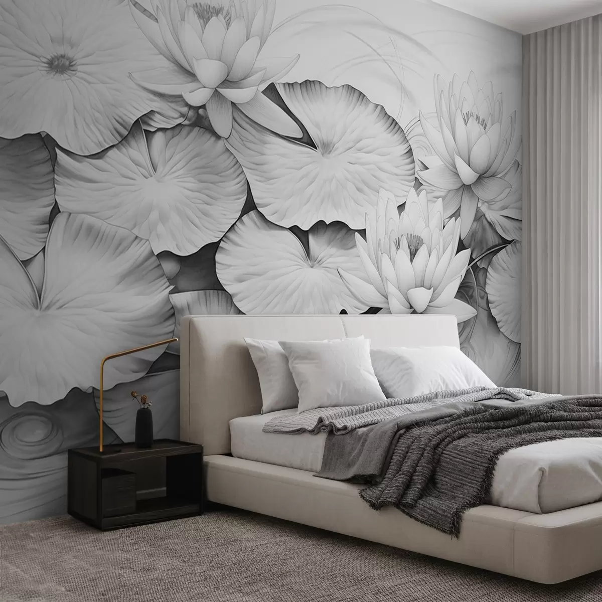 Fototapet Nuferi și nuferi într-un iaz, imitație alb-negru a desenului în creion, ilustrație botanică detaliată, artă a naturii Nr. w09006