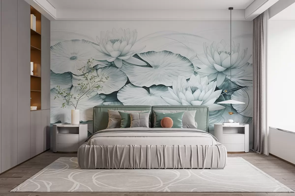 Fototapet Nuferi și nuferi într-un iaz, turcoaz și alb imitație de desen în creion, ilustrație botanică detaliată, artă a naturii Nr. w09006v1