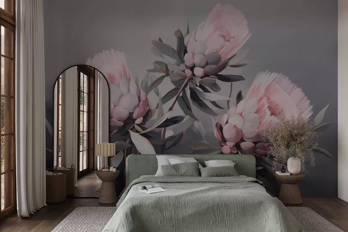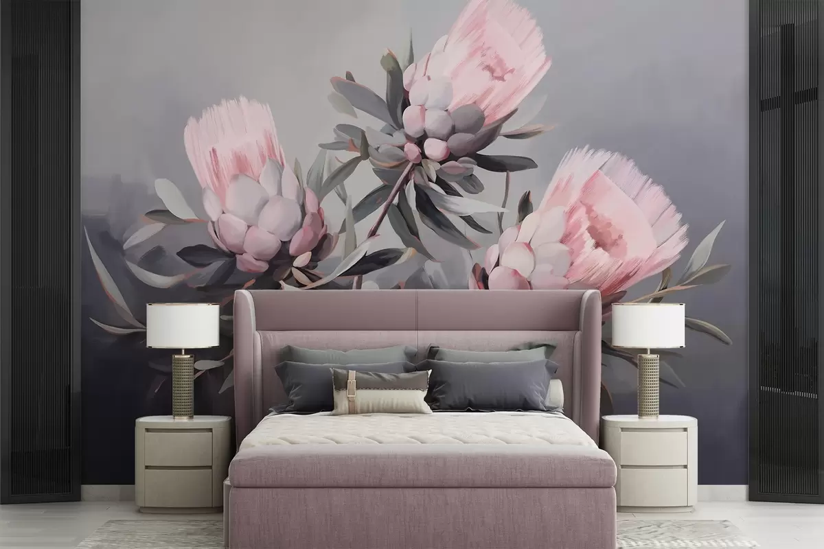 Fototapet Flori abstracte roz protea cu frunze gri, tușe de pensulă cu textură moale, culori atenuate, pe un fundal gri neclar Nr. w09014