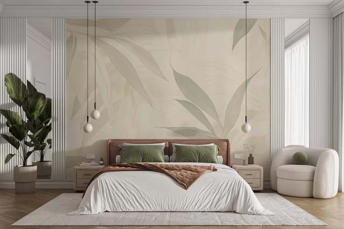 Fototapet Ramuri cu frunze în tonuri moi de verde pe un fundal bej Nr. w09027