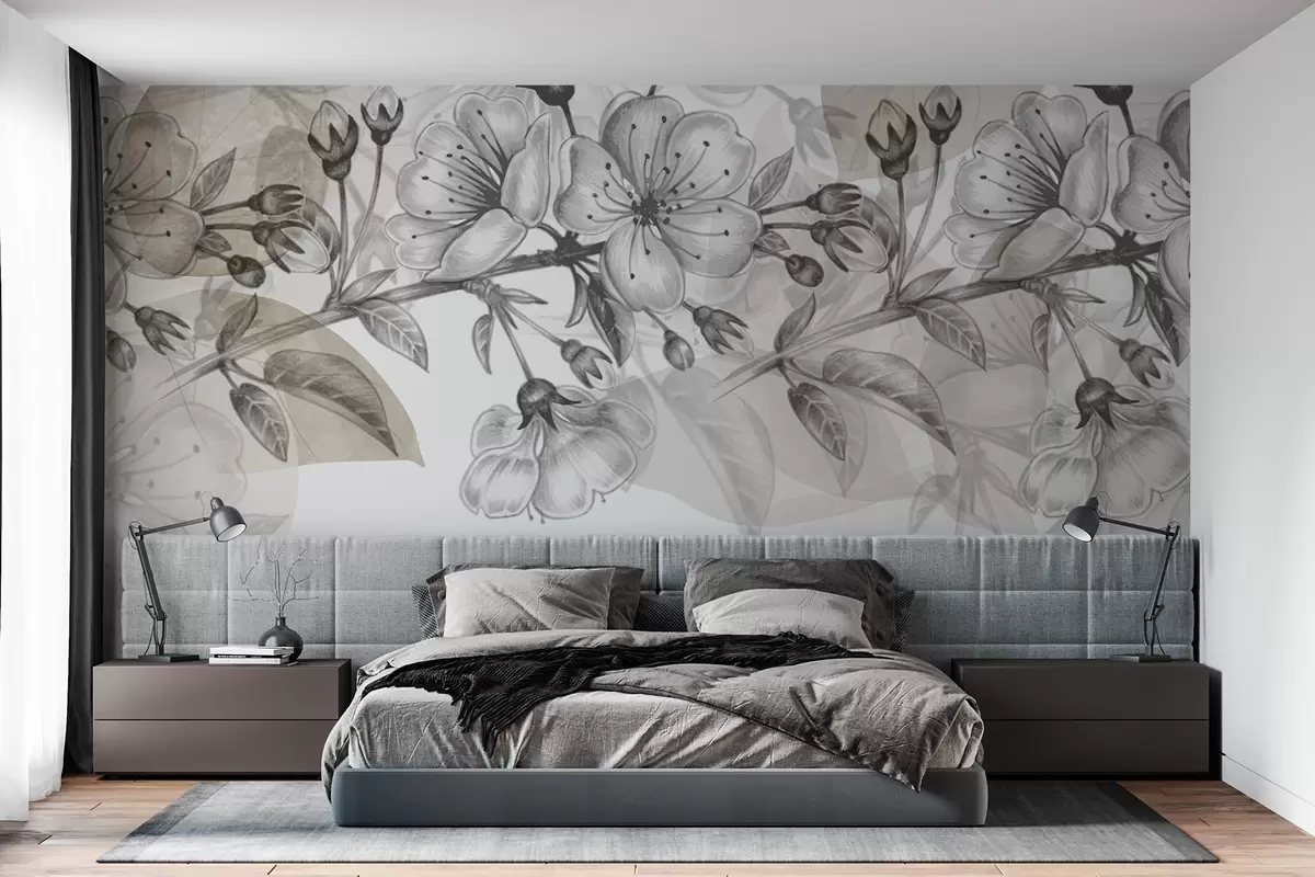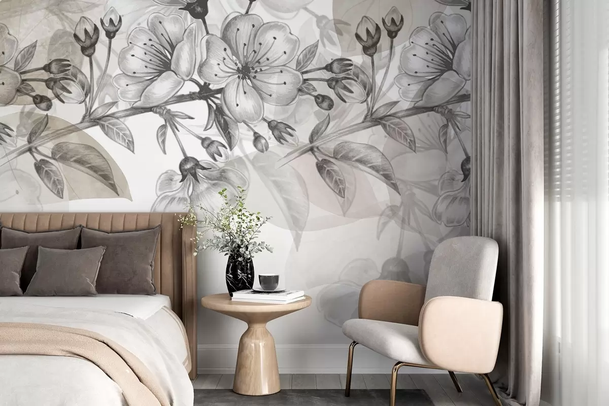 Fototapet Ramură de flori de cireș cu flori și muguri, tonuri sepia, fundal moale de acuarelă cu nuanțe gri și maro Nr. w09051v1