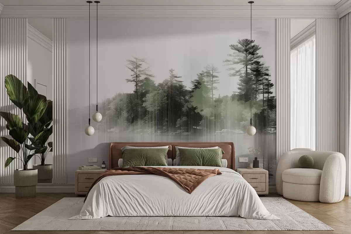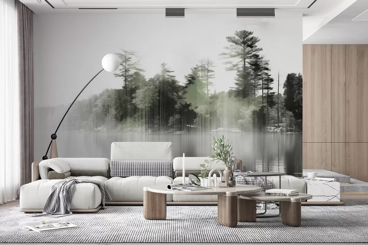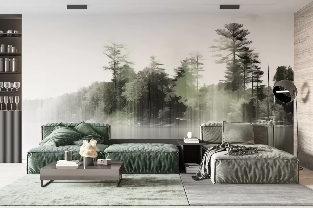 Fototapet Abstract minimalism texturat peisaj cu un lac și copaci reflecții în apă în nuanțe de verde și alb Nr. w09058