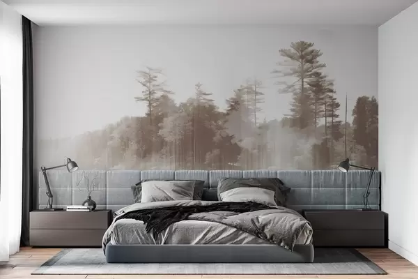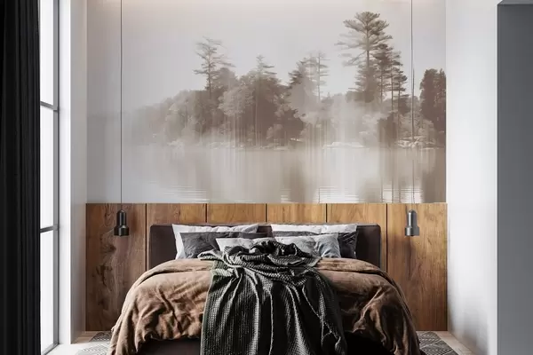 Fototapet Abstract minimalism texturat peisaj cu un lac și copaci reflecții în apă în nuanțe de bej și alb Nr. w09058v1